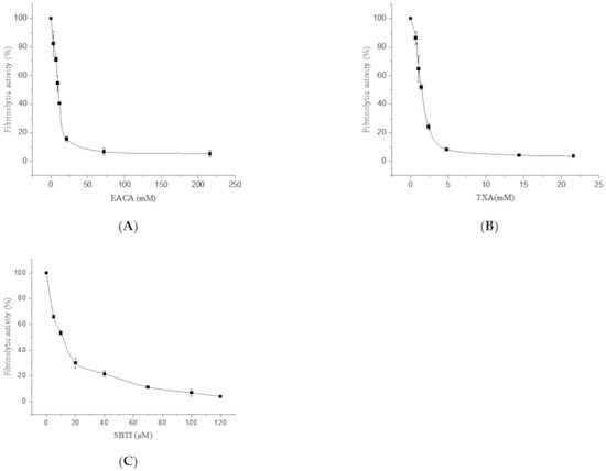 The fibrinolytic activity of FGFC1 at different concentrations of EACA (0–216 mM) (A), TXA (0–21.6 mM) (B), and SBTI (0–120 µM) (C). The reaction was incubated at 37 °C and measured at 405 nm using a microplate reader every five minutes for 120 min. Results are expressed as a percentage of the fibrinolytic activity in the absence of EACA, TXA, and SBTI. The results are expressed as the mean ± SD, performed in triplicate. The concentration of FGFC1 for the FGFC1 + EACA, FGFC1 + TXA, and FGFC1 + SBTI assays was 0.12 mM.