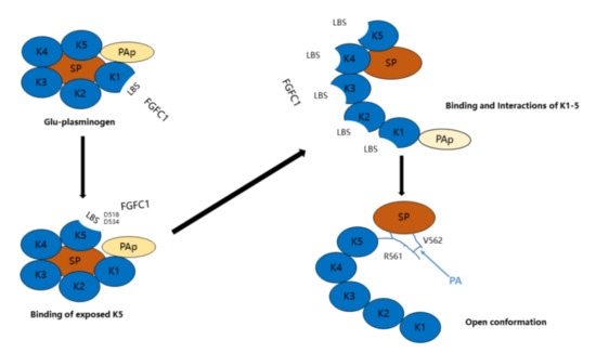The mechanism of FGFC1–plasminogen interaction was inferred from a comprehensive analysis of previous studies and current results. The main points are described below. When the concentration of FGFC1 is relatively low, the function of FGFC1 may mimic the cell surface or fibrin. The mechanism of plasminogen activation by FGFC1 is shown in Figure 9. FGFC1 initially binds to the LBS of KR1, resulting in the peeling of KR5 from PAp and its exposure in closed plasminogen. Subsequently, FGFC1 mainly interacts with Asp518 and Asp534 of the exposed KR5, triggering a conformational change and structural rearrangement. At this moment, the additional LBSs of the kringle domains are exposed, allowing the PAp domain to move. Thus, FGFC1 can bind to additional LBSs, and a series of interactions occur with the kringle domains, leading to the formation of an open conformation that is readily activated by plasminogen activators. By contrast, when the concentration of FGFC1 is relatively high, FGFC1 may functionally mimic EACA or TXA due to having similar functional groups (carboxyl group and Nɛ sidechain) and binding sites for plasminogen. Excess FGFC1 may bind specific sites of plasminogen, resulting in the formation of an abnormal conformation, which inhibits the activation of plasminogen.