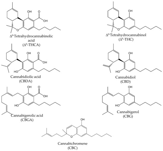 In Cannabis, cannabinoids are biosynthesized in the acidic form in plant tissues, psychologically inactive precursors, producing cannabidiolic acid (CBDA), and cannabigerolic acid (CBGA) in fiber-type plants, while Δ9-tetrahydrocannabinolic acid (Δ9-THCA) in drug-type ones. A spontaneous decarboxylation process can occur by heat or light, generating the neutral counterparts, including CBD, CBG and Δ9-THC [8]. In addition, to the properties of CBD and Δ9-THC described above, many studies proved that other minor components, such as CBG and CBC, possess anti-inflammatory, antibacterial and antifungal activities. Cannabinol (CBN) and cannabinolic acid (CBNA), deriving from the oxidative degradation products of Δ9-THC and Δ9-THCA, respectively, present in matured cannabis samples, have potent sedative properties [8,9,10].