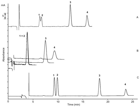 Nano-LC chromatograms of the separation of the four cannabinoids on different stationary phases: capillary columns (100 µm × 25 cm) packed with (A) Cogent Bidentate C18 dp 4.2 µm, (B) Gemini C18 dp 5 µm, (C) ChromSpher C18 dp 3 µm; mobile phase, acetonitrile/H2O/formic acid, 80/19/1% (v/v/v); UV detection, 214 nm; standard mixture concentration, cannabigerol (CBG) and cannabidiol (CBD) at the concentration of 15 µg/mL, cannabichromene (CBC) and Δ9-tetrahydrocannabinol (Δ9-THC) at a concentration of 30 µg/mL; injection time, 15 s; flow rate, 550 nL/min. (1) CBG, (2) CBD, (3) Δ9-THC, (4) CBC.