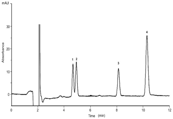 Separation of the four cannabinoids achieved with the short column: capillary column (100 µm × 15 cm) packed with ChromSpher C18 dp 3 µm; mobile phase, ACN/H2O/formic acid, 80/19/1% (v/v/v). UV detection, 214 nm; standard mixture concentration, CBG, CBD and Δ9-THC at the concentration of 15 µg/mL, CBC at a concentration of 25 µg/mL; injection time, 15 s; flow rate, 550 nL/min. (1) CBG, (2) CBD, (3) Δ9-THC, (4) CBC.