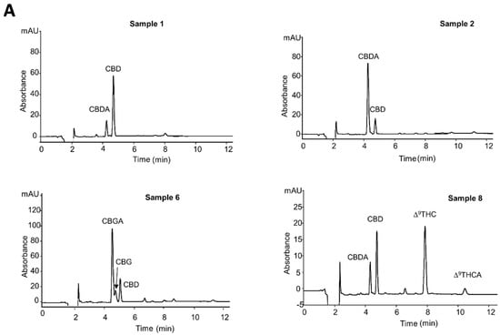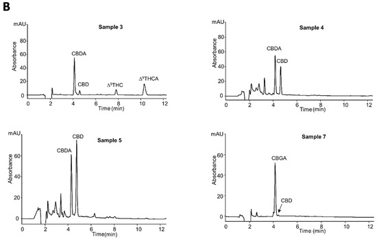 In Figure 4A,B the nano-LC-UV chromatograms of the analyzed hemp extracts are shown.