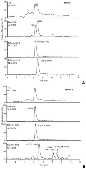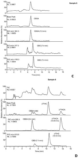 In Figure 5A–D, the total ion (TIC), base peak, and extracted ion chromatograms of samples 1, 2, 6, 8 are depicted. As can be observed, the base peak and the extracted ion chromatograms (EIC) allow identifying the main cannabinoids, including also Δ9-THC and Δ9-THCA not quantified with the nano-LC-UV system in samples (C1, C2, C6).