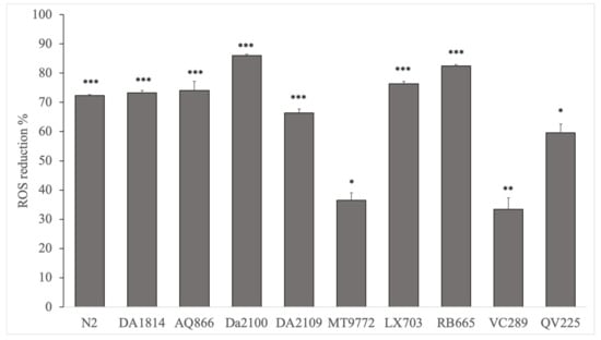 | Stress Reduction (%) | N2 | AQ866 | DA1814 | Da2100 | DA2109 | MT9772 | RB665 | LX703 | VC289 | QV225 | Stress Reduction Mean (%) |