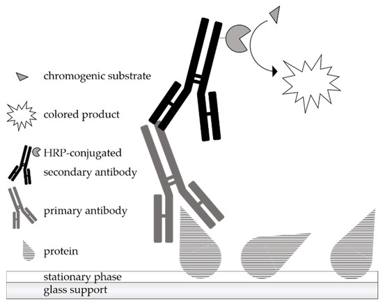 Schematic representation of the principle of an indirect antibody-based detection of proteins after chromatographic separation (HPTLC-IS). The primary antibody having affinity for the target protein is associated with the HRP-conjugated secondary antibody specific for the host of the primary antibody. Visualization of the ligated antibodies is achieved by the formation of a colored precipitate derived from a chromogenic substrate.