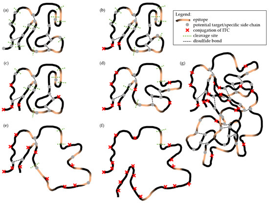 In the following, the previously described results from Figure 2 and Figure 3 will be illustrated and explained at hand of Figure 4. This figure serves to facilitate understanding and schematically depicts the influence of ITC conjugation on the structure, on the epitopes, and on the potential tryptic cleavage sites of the protein, when being successively modified with ITC, and depending on the degree of α-LA modification. It should be noted that only different model scenarios are illustrated, and that the discussion is based on a hypothetical approach for describing the impact of protein modifications on its antigenicity (creation and destruction of epitopes) in accordance with the current literature. Protein structure, the locations of epitopes, disulfide bridges, and tryptic cleavage sites are not depicted realistically, but only schematically for illustrating the different outcomes from a certain degree of modification possible.