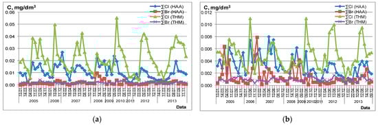 Integral content of chlorine and bromine in THM and HAA in the drinking water of the surface intake (a) and infiltration intake (b) in 2005–2013.