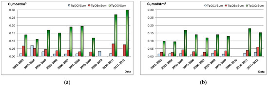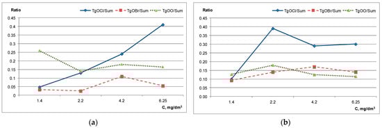 Monitoring or technological studies of water quality are generally based on comparative analysis, i.e., decrease or increase in the levels of the targeted components after some changes in the process. Considering that SVOC composition remains more or less constant for the selected water intake and water preparation technology, when carrying out comparative studies, we did not take into account isolation factors of the individual compounds used for the calculation of TgOC, TgOCl, TgOBr and TgOO. Detection limits for these indices were as follows TgOC—1 × 10−5 mg/dm3, TgOCl and TgOBr—1 × 10−6 mg/dm3, TgOO—1 × 10−4 mg/dm3.
