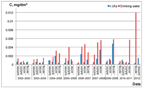 Seasonal values of TgOO, mg/dm3, in the water of the Ufa River and drinking water of SI.