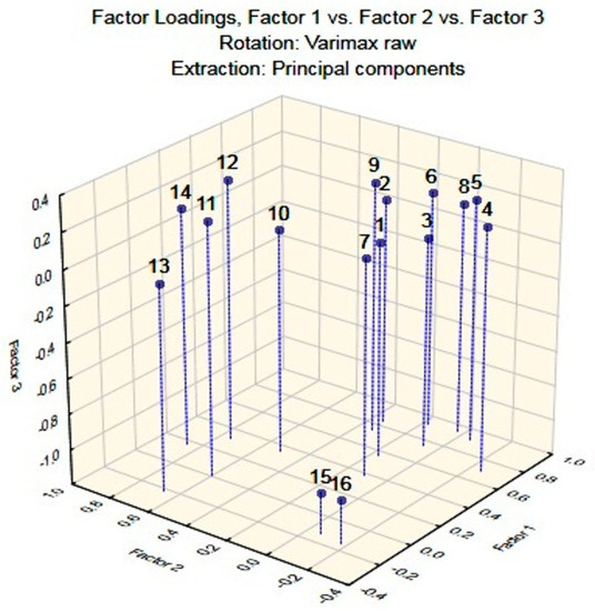 Results of the PCA analysis of the parameters related to the river and drinking water demonstrating three separate groups. 1. primary chlorine dose, 2. secondary chlorine dose, 3. COD (river), 4. turbidity (river), 5. color (river), 6. PMI (river), 7. DOM (river), 8. A254 (river), 9. DOC (drinking water), 10. A254 (drinking water), 11. Br level in HAA, 12. Cl level in HAA, 13. Br level in THM, 14. Cl level in THM, 15. TgOCl, 16. TgOBr.
