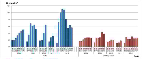 All the discussed results of the correlation analysis were based on the long-term monitoring with the exception of flood periods. Correlations for chromaticity/PMI, chromaticity/COD, turbidity/PMI, turbidity/COD and COD/PMI for the Ufa River increase, while the CC for the pairs DOM/turbidity, DOM/chromaticity and DOM/PMI do not change or even decrease during floods. These results may testify that organic compounds of different natures (i.e., soil flushes with melted snow) appear in river water [68]. A major portion of organic compounds composing DOM participate in continuous biotransformation processes in water and sediments, thus, DOM represents the most reactive component of aquatic ecosystems sensitive towards any changes of the external environment [69]. Figure 6 contains the data on DOC in the Ufa River and illustrates a possible sharp change in the water quality in the flood periods of 2004–2012. Thus, in 2012, DOC significantly increased in the Ufa River water, while drinking water possessed a persistent chemical smell, which could not be eliminated by changing the reagent doses during flocculation/coagulation procedures. Nevertheless, integral parameters, including COD and PMI, did not notably increase, and the levels of THM and HAA remained at their usual values. On the contrary, the levels of halogenated SVOCs increased (Figure 7). The latter fact allows for making the conclusion that additional DOM during floods consists of heavier organic structures not so easily oxidizable with the formation of VOCs.
