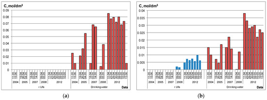Another issue worth mentioning involves an increase in the bromine content in HAA in IW in the fall–winter period. Figure 8 illustrates corresponding results in the years when that effect was particularly pronounced. That issue may be rationalized by a higher percentage of underground water in the wells. It is highly mineralized in comparison with river water also penetrating the wells (up to 80% in summertime). The effect nicely correlates with the increase in the water hardness in these periods. River water does not demonstrate the mentioned seasonal effect.