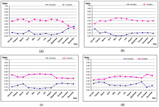 Relative content of Br and Cl in HAA in IW in 2006 (a), 2011 (b), 2012 (c), 2013 (d).