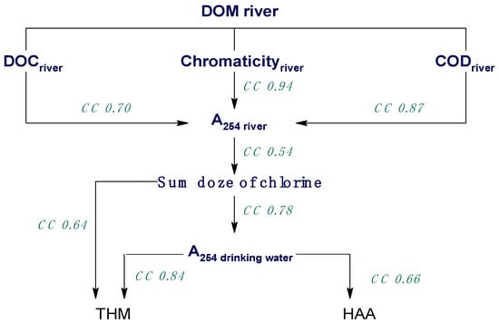The absence of the direct correlations between THM, HAA and SUVA of the treated water was mentioned previously [53]. However, the authors emphasized that that is applicable only for natural water with low values of SUVA and UV absorption, as SUVA does not cover reactive sites in DOM responsible for the formation of DBPs. Nevertheless, studying chloroamination [66], the authors obtained linear correlations between SUVA and the formation of dichloroacetic acid (CC 0.82) and chloroform (CC 0.73), proving the decisive influence of the matrix and nature of the chlorinating agent.