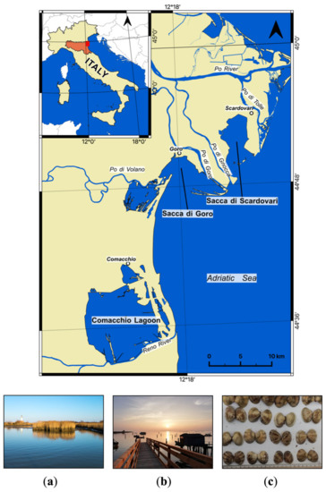 This study was focused on three different lagoons located along the Italian northern Adriatic coast within the delta of the Po river, which is the principal Italian fluvial system [34,35]. In particular, we investigated clams from “Sacca di Goro” (44.82° N, 12.31° E) and “Sacca di Scardovari” (44.86° N, 12.42° E), two embayments connected to the Adriatic Sea through a wide mouth that are partly obstructed by sandy banks and are influenced by the interaction between fresh and marine waters that contributes to widespread deposit of the related sediment load [36,37]. Sacca di Goro is a micro-tidal lagoon (area: 26 km2; mean depth: 1 m; Figure 1a [36]) that receives nutrient-rich freshwater from two branches of the Po river, Po di Goro and Po di Volano (Figure 1). Sacca di Scardovari is a micro-tidal, large embayment (area: 32 km2; mean depth: 1.5 m; Figure 1b [36]) that receives nutrient-rich freshwater from other two branches of the Po river: Po di Gnocca and Po di Tolle (Figure 1). The third lagoon considered in this study was the Comacchio Lagoon (44.61° N, 12.17° E), which is a large non-tidal lagoon (area: 100 km2; mean depth: 0.8 m [36]) as it does not directly open toward the sea.
