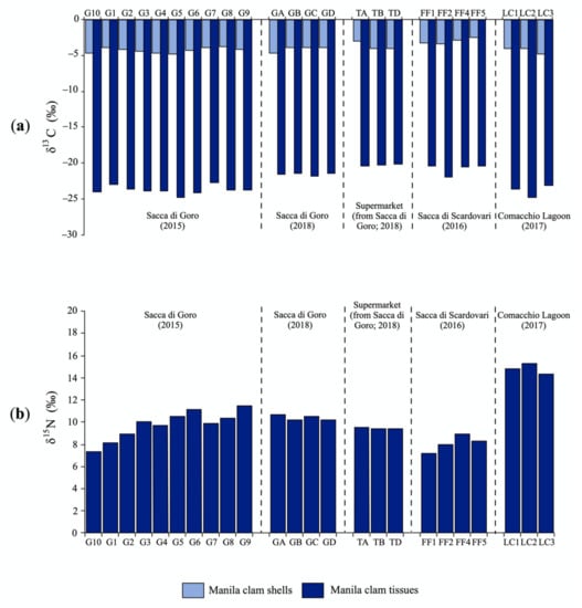 Considering the manila clam tissues, the C and N contents varied among the samples without defined inter- or intra-lagoon trends. For all manila clam samples, the C/N ratio was ~4, which is indicative of the similar lipid contents, which is in turn correlated with the size of the bivalve [2,52].