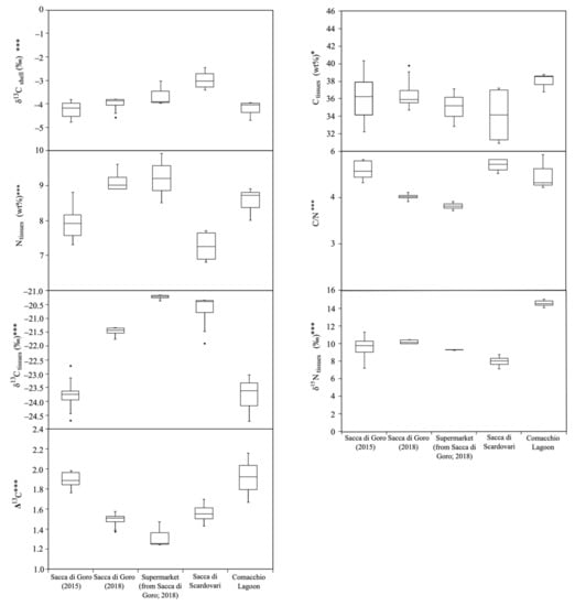 Box plot of elemental and isotopic compositions of carbon (C) and nitrogen (N) in the shells and tissues of manila clam samples collected onsite from north-western Adriatic lagoons and bought at the local supermarket. One-way ANOVA is also reported (* p < 1; ***p < 0.0001).