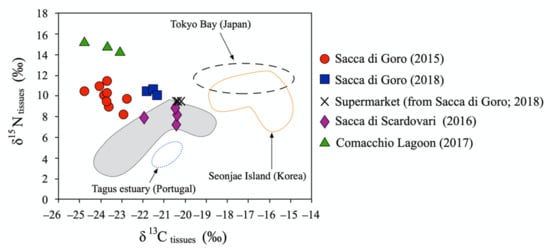 On the other hand, at the world scale, the C and N isotopic compositions of manila clams seem to be sufficient for the identification of at least the country of the origin. In fact, in Figure 4 the entire manila clam population from the north-western Adriatic lagoons is shown to be isotopically distinct from those of other Ruditapes philippinarum populations growing in other fisheries widespread throughout the world (e.g., Portugal, Korea, Japan [2,52,59]), as it has the most negative δ13C (up to –24.7‰) value and the most positive δ15N (up to +15.2‰) value. Therefore, at a large scale, the diet of bivalves becomes the main variable for the isotopic characterization of the clams. Generally, filter-feeding bivalves feed on marine particulate organic matter suspended in the water column (e.g., phytoplankton, microphytobenthos and detritus [36]). In the north-western Adriatic lagoons, the dispersed particulate is deeply affected by the fluvial contribution of the Po river system that conveys a large amount of solid suspended load with δ13C and δ15N signatures up to −28.2‰ and +8.6‰, respectively, toward the sea [57,58]. In fact, as shown in Figure 4, considering the trophic enrichments of Ruditapes philippinarum (0.6‰ for δ13C and 3.4‰ for δ15N; [32]), the isotopic compositions of the tissues of the investigated clams can easily be related to the average δ13C and δ15N signatures of the Po river suspended load.