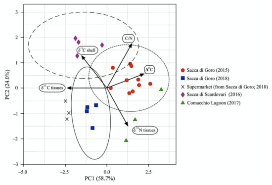 The resulting PCA (Figure 5) explains more than 80% of the total variation and well clusters the samples into four groups reflecting their different geographical origins and, in the case of Sacca di Goro, also the year in which clams were collected. Sacca di Scardovari and Comacchio Lagoon samples formed distinct groups, with Sacca di Scardovari samples being characterized by less negative δ13C values for both shells and tissues and the Comacchio Lagoon group was driven by high δ15N and more negative δ13C values of tissues. For Sacca di Goro, samples collected in 2015 were separated from those collected in 2018, mainly in terms of the ∆13C and C/N values. Interestingly, the clams bought at the supermarket, with the label certifying they were collected in Sacca di Goro in 2018, were plotted near to the group of samples collected onsite in Sacca di Goro in the same year, as they are characterized by similar values in δ13C of tissues and shell, C/N and ∆13C. Contrary to the binary plot shown in Figure 4, the PCA plot of Figure 5 clearly shows that the certified manila clams bought at the supermarket were similar to the samples collected onsite in Sacca di Goro in 2018. This demonstrates that a multivariate analysis is the best approach for tracing clams at the regional scale, as it condenses a large number of original variables into a composite dimension with a minimum loss of information.
