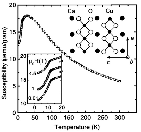 - Shengelaya, A.; Meijer, G.I.; Karpinski, J.; Zhao, G.M.; Schwer, H.; Kopnin, E.M.; Rossel, C.; Keller, H. Spontaneous mag-netization and antiferromagnetic correlations in the CuO2 chains in Sr0.73CuO2. Phys. Rev. Lett. 1998, 80, 3626. [Google Scholar] [CrossRef]