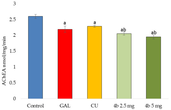 Acetylcholinesterase (AChE) activity measured for 10 min in brain homogenates derived from mice treated 14 days by GAL, CU, 4b in two doses (2.5 mg/kg and 5 mg/kg) or placebo (control group). ap < 0.05 vs. control bp < 0.05 vs. CU.