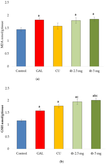 The oxidative stress causes decrease in GSH levels [9]. All tested compounds in the present study elevated the GSH levels (Figure 3b) showing antioxidant activity. The most prominent effect has 4b in dose of 5 mg/kg (73%), followed by 4b in dose of 2.5 mg/kg (67%), CU (52%) and GAL (35%).