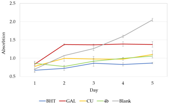 LPO inhibitory activity of GAL, CU and 4b monitored for 5 days. Absorbance is given in mean ± standard deviation (n = 3). BHT is used as a positive control, MeOH as a blank.