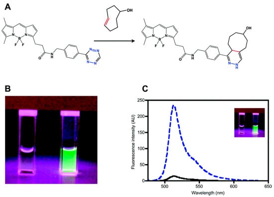 - Carlson, J.C.T.; Meimetis, L.G.; Hilderbrand, S.A.; Weissleder, R. BODIPY–Tetrazine Derivatives as Superbright Bioorthogonal Turn-on Probes. Angew. Chem. Int. Ed. 2013, 52, 6917–6920. [Google Scholar] [CrossRef]