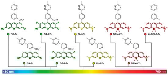 Because the FRET-based strategies for fluorescence quenching have higher efficiency with regard to the spectral overlap of the donor and acceptor fluorophores, their quenching efficiency is wavelength-dependent. Since tetrazine has an absorption maximum of approximately 530 nm, the quenching efficiency of tetrazine decreases with fluorophores exhibiting a red shift. To overcome this limitation, Dexter-type electron exchange strategies have been examined, which involve the direct incorporation of tetrazines into fluorophores to decrease the distance between the donor (fluorophore) and acceptor (tetrazine) molecules. For instance, Wombacher et al. reported green- to far-red-emitting fluorogenic tetrazine probes, which were prepared by the direct conjugation of tetrazine with xanthene fluorophores via C–C bond-forming reactions []. As this molecular design provides a short distance between tetrazine and the fluorophore, this strategy allowed for the development of xanthene–tetrazine derivatives that exhibited fluorescence over the broad visible range of emission, from green to far-red (Figure 2). This could not be achieved with previous FRET-type molecular-design strategies.