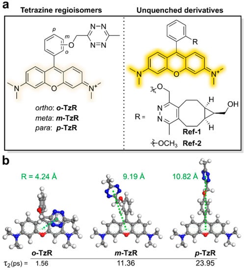 Molecular-design strategy for Dexter-type fluorogenic tetrazine probe. (a) Chemical structures of tetrazine isomers and unquenched derivatives of rhodamine dyes. (b) Density functional theory (DFT)-optimized structures of regioisomers and expected intermolecular distances between their tetrazine units and xanthene core. Reproduced from [].