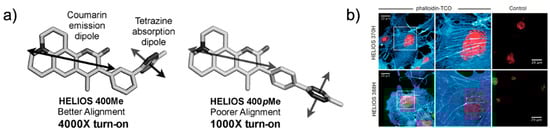 Soon after, Weissleder et al. reported a fluorogenic bioorthogonal probe based on a coumarin fluorophore []. Employing their TBET strategy, they modified the coumarin fluorophore to synthesize hyperemissive ligation-initiated orthogonal sensing (HELIOS) probes having a phenyl pendent with tetrazine at the meta-position of the coumarin core (Figure 5). Depending on the coumarin structure, the HELIOS probe can have a varying blue-green spectrum (from 455 to 502 nm) with a high turn-on ratio (2500- to 11,000-fold enhancement). This study again highlighted that the transition dipole between the fluorophore and tetrazine is important for efficient fluorescence quenching (Figure 5a).