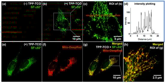They confirmed full integration between tetrazine and a model, SF fluorophore system [] by acquiring the absorption spectra. In addition, they found that the oscillator strength (f) of the structure significantly increased after the iEDDA reaction. Based on this observation, they proposed that the iEDDA reaction changed the major contributor of the S0–S1 transition of the probes from the optically forbidden n→π* transition to the optically active π→π* transition, thereby promoting the fluorescence emission process (Figure 6b). Considering the increased interest in mitochondrial biology, a new tetrazine fluorophore was used to visualize the mitochondria (Figure 7). Triphenylphosphonium (TPP)–TCO was synthesized and incubated with HeLa cells. After treatment with SFTz02* or SFTz08* (the more soluble forms of SFTz02 and SFTz08, respectively), crisp fluorescent mitochondrial images with exceptional contrast were obtained. They further confirmed the specificity of the probe through a co-staining experiment with a conventional fluorescent mitochondrial probe, MitoTracker Deep Red.