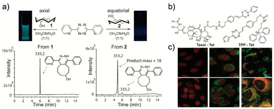 Formation of a new fluorophore after an iEDDA reaction. (a) Reaction between 3,6-di(2′-pyridyl)-5-tetrazine (DiPyTet) and TCO gave different products. In this study, the reaction of the axial TCO isomer (TCOa) with DiPyTet resulted in new fluorophore formation. (b) Chemical structure of tetrazine modified with Taxol® and TPP (Taxol®–Tet and TPP–Tet, respectively) in this study. (c) Confocal laser microscope images of U2OS cells treated with Taxol®–Tet (upper row) or TPP–Tet (lower row), followed by DMSO (left column) or TCOa (middle column) treatment. The merged images obtained from co-staining experiments with commercial mitotracker or tublin tracker (right column) confirmed the specificity of the probes. Reproduced from [].