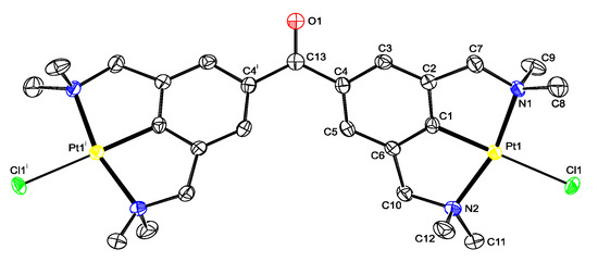 Platinum pincer aldehyde [PtBr(NCN-CHO-4)] 11, a complex developed in a previous study [22,24], was used in a homocoupling reaction under McMurry conditions, in order to synthesize the bisplatinum-stilbene compound 12 (Scheme 2). After workup, the isolated product consisted of a mixture of compounds, also containing the starting aldehyde 11. In attempts to separate the product mixture into separate components, a yellow crystalline solid was obtained after crystallization of the mixture from toluene solution. The structure in the solid state was determined with X-ray crystallography, and, surprisingly, confirmed the crystals to be of the bimetallic benzophenone platinum pincer 13; i.e., rather than 12 the coupling product 13 was obtained in which the two platinum pincer fragments are connected via a carbonyl linker. No signals of the stilbenoid product 12 were found in the residue. During the coupling reaction on the titanium surface, an as yet unclear reaction has occurred. From the crystal structure data (see Figure 1), it was also observed that there is substitutional disorder between bromine and chlorine on the halogen sites, the chlorido ligand likely having been delivered by TiCl4.