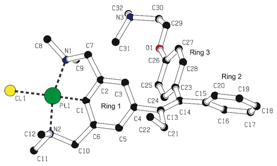 Crystals of 5b were obtained by slow evaporation of a toluene/ethanol/dichloromethane mixture containing the compound. For 5b, the overall conformation of the structure is similar to that of other tamoxifen-based structures in the solid state (Figure 2) [26,36]. The triphenylethylene system containing the platinum pincer fragment (ring 1), the unsubstituted phenyl (ring 2) and the 4-[2-(dimethylamino)ethoxy]phenyl (ring 3), adopts a propeller conformation.