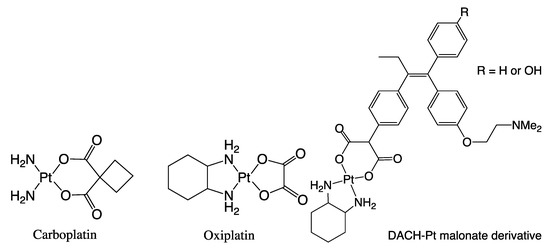 Based on the bonding motifs present in the well-known and clinically used Pt-based antitumor drugs [48,49] such as cisplatin (i.e., cis-[PtCl2(NH3)2]) [50,51] and other platinum containing complexes (Carboplatin® and Oxiplatin®: Figure 3), the Jaouen group also synthesized and screened diaminocyclohexane-malonate-platinum(II) derivatives of Tamoxifen®: DACH-Pt (Figure 3) [27]. In contrast to the stability of the organometallic fragments in ferrocifen and pincercifen, the lability of this type of platinum complexes shown in Figure 3 under physiological conditions is sometimes used to release and deliver an active metal center close to the target site [27]. However, this lability can also be problematic, especially when the metal center is released before reaching the receptor or target site [5]. In the case of ferrocifen and pincercifen, it is the stability of the respective organometallic groupings that can be an advantage, because it is shown for both complexes that the covalently bound metal center is compatible under a diversity of reaction conditions without the cleavage of the metal-C sigma bond [24].