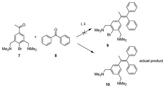 Attempted Synthesis of 1-(1,1-Diphenyl-1-propenyl)-4-bromo-3,5-bis[(dimethylamino)methyl]Benzene (9); Formation of 1-(1,1-Diphenyl-1-propenyl)-3,5-bis[(dimethylamino)methyl]Benzene (10)