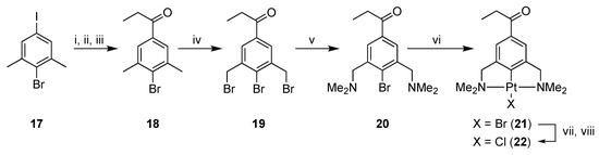 Proceeding on our quest to synthesize 5 and 6, platinum-containing ketone 22 was synthesized starting from 4-iodo-1-bromo-2,6-dimethylbenzene (17) [22,24] via a multistep reaction procedure (Scheme 4). In the first step, the iodo group of 17 was selectively substituted with lithium by a metallation reaction with n-BuLi at low temperature. The lithiated species was reacted in situ with N,N-dimethylpropionamide and after hydrolysis 4-bromo-3,5-dimethylphenyl ethyl ketone 18 was obtained, which was converted to bis-benzyl bromide 19 via a radical bromination reaction [32].