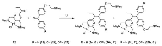 In order to be able to prepare 6, we first functionalized 4,4′-dihydroxybenzophenone 27 with a single 2-(dimethylamino)ethoxy group, obtaining 24 according to a modified literature procedure [35]. Repeated attempts to couple 22 and 24 in order to obtain 6′ i.e., the precursor of 6 (as E-/Z-mixture) failed, and only the starting metal complex 22 was recovered from the reaction mixtures. Presumably, the free phenol group in 24 hampers the coupling reaction. Therefore, it was decided to protect the phenol group of 24 with a tert-butyldimethylsilyl (TBDMS) group (Scheme 6). When 24 was reacted with TBDMS-Cl using imidazole as a base, no reaction took place to form the desired product. The use of NaH was likewise not successful. It was decided to prepare the single protected pivaloyl (OPiv) hydroxybenzophenone 28 instead using a literature procedure [35]. Next, 28 was functionalized with a dimethylaminoethoxy group offering 25.