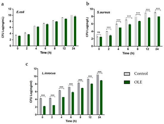 For E. coli, OLE did not exhibit any significant antimicrobial effect (Figure 1a). Conversely, in S. aureus and L. innocua statistically significant antimicrobial effects were observed over time (Figure 1b,c). In particular, for L. innocua OLE showed a reduction in the number of colonies even if inactivation was not reached (Figure 1c).