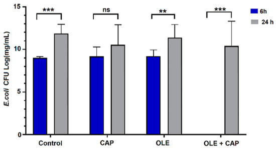 The potential synergistic effect of OLE and CAP was evaluated at two relevant time points, 6 h and 24 h after application of OLE, CAP or OLE + CAP, using previously published methods [47,48,49]. The comparison of results obtained after 6 h and 24 h using the single treatment and their combination is reported in Figure 2, Figure 3 and Figure 4. Using the combined OLE + CAP treatment, E. coli had significant inhibition at 6 h, while at 24 h the bacteria reproduced, but still with a significant reduction with respect to the control and individual treatments (Figure 2). The most remarkable effect was obtained against S. aureus (Figure 3).