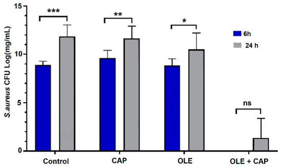 S. aureus samples subjected to OLE + CAP treatment significantly decreased after 6 h and 24 h compared to control and single treatments. The effectiveness of the combined treatment was confirmed by a very low replication of residual bacteria at 24 h.