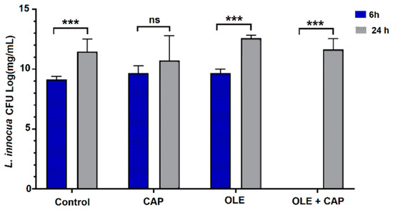 The effects of CAP (1 min exposure time) and/or OLE on L. innocua. The values are reported as mean ± standard error of the mean (SEM) (n = 3), significance at p < 0.05 by One-way ANOVA and Tukey’s HSD post hoc test; *** p < 0.0001, n.s. not significant.