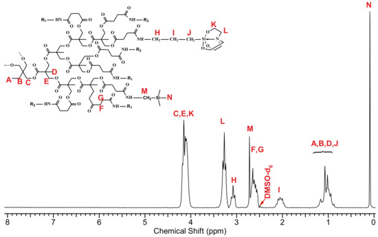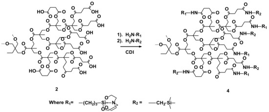 Substitution of free carboxyl groups was monitored by 1H-NMR, and for both polyglycerol and Boltorn H40, the integral intensities of the signals were compared, corresponding to methylene groups of silatrane, methylene groups of succinic acid and methyl and methylene groups of (aminomethyl)trimethylsilane.
