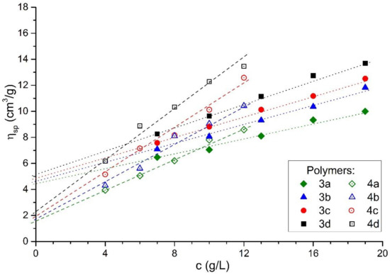 To obtain additional information on the studied polymers’ behavior in solutions, their intrinsic viscosities were determined in THF. Figure 8 shows the relationship between the specific viscosity of polymers 3a–d and 4a–d at various concentrations.