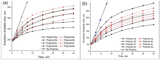 Since the formation of stable emulsions may be one of the desirable properties of polymeric surfactants, we tested the potential role of the polymers as stabilizers of direct (“oil in water”) and reversed (“water in oil”) emulsions. The droplet size of direct emulsions was shown to significantly exceed the droplet size of reverse emulsions in the presence of each of the studied polymers (Figure 10).