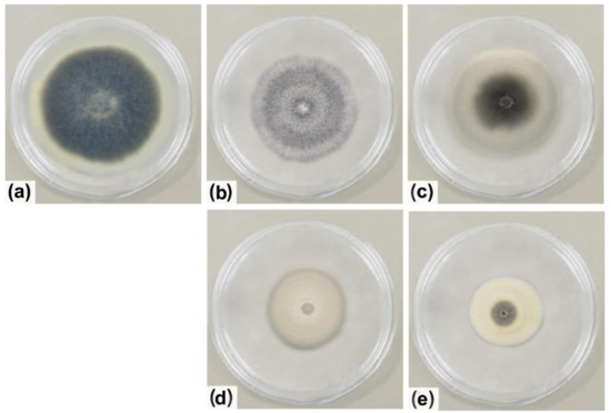 Influence of silatrane polymers on the growth of Verticillium dahliae colonies. (a) control colony; (b) polymer 3c; (c) polymer 4c; (d) polymer 3d; (e) polymer 4d. The time after inoculation is 7 days.