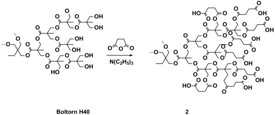 In a typical procedure, 4.00 g (40 mmol) of succinic anhydride were dissolved in 75 mL of anhydrous THF in a 150 mL flask at 40 °C under vigorous stirring. Succinic anhydride being completely dissolved, the mixture of a branched polymer (2.10 g Polyglycerol or 2.85 g Boltorn H40, 25 mmol hydroxyl groups) and 4.04 g (40 mmol) of triethylamine, dissolved in 50 mL of anhydrous DMSO, was slowly added into the flask and the final mixture was reacted for 4 h. The crude product formed was precipitated twice with cold diethyl ether and dialyzed against THF (Roth “ZelluTrans” membrane (Carl Roth GmbH + Co. KG, Karlsruhe, Germany), MWCO = 1000 Da) for 48 h.