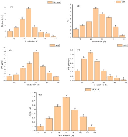 Effect of the incubation period on (A) phytase activity; (B) the production of siderophore units (SU); (C) Indole acetic acid (IAA) production; (D) Exopolysachharide (EPS) production; and (E) 1-aminocyclopropane-1-carboxylate deaminase (ACCD) activity of K. variicola SURYA6. Values are the average of five replicates and were analyzed by one-way ANOVA followed by Turkey’s test. Different letters on mean value of each parameter indicate significant differences at p < 0.05.