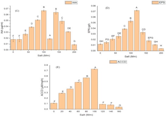 K. variicola produced a good amount of PG traits at a varying range of salt concentrations. An increase in the amounts of PGP traits was observed with increasing concentrations of salt. The threshold level of salt (NaCl) that inhibited phytase activity was 100 mM (Figure 3). Siderophore production (Figure 3B) ceased and was negatively impacted above 100 mM of NaCl concentration, while salt-ameliorating traits such IAA (Figure 3C), EPS (Figure 3D), and ACCD (Figure 3D) reflected a higher threshold level (120 mM) of salt. The maximum phytase activity of 8.46 ± 2.1 (IU/mL) was observed at 120 mM of NaCl (Figure 3A); the optimum siderophore units (77.42 + 0.18) were produced at 100 mM of NaCl (Figure 3B) while the highest amount of IAA (99.32 ± 1.8 µg/mL) (Figure 3C), maximum EPS (72.2 ± 1.1 g/L) (Figure 3D) and optimum ACCD activity (0.981 M/mg/h) (Figure 3E) were recorded at 120 mM of salt.